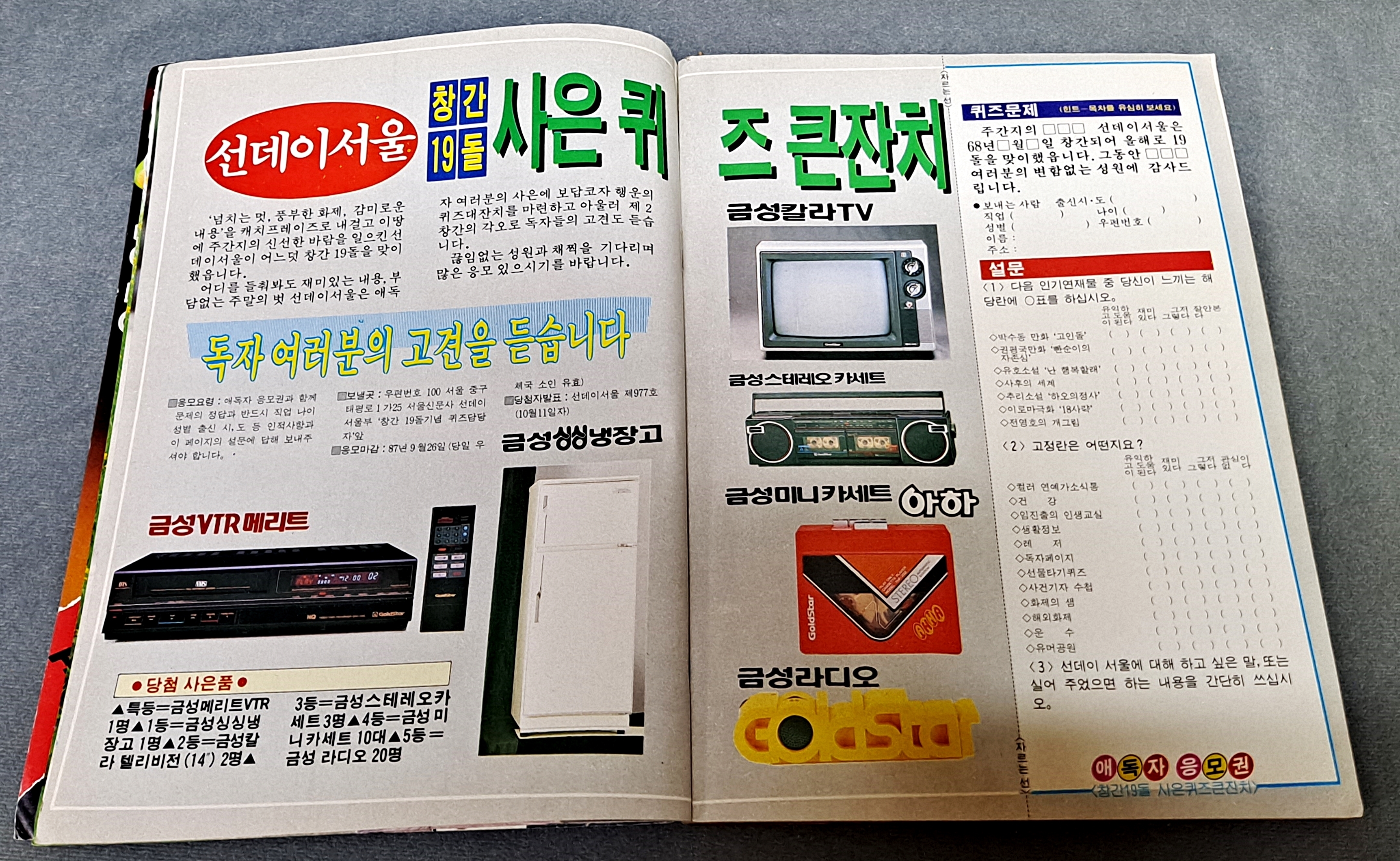 선데이 서울 창간 19돌 사은 퀴즈 큰찬치