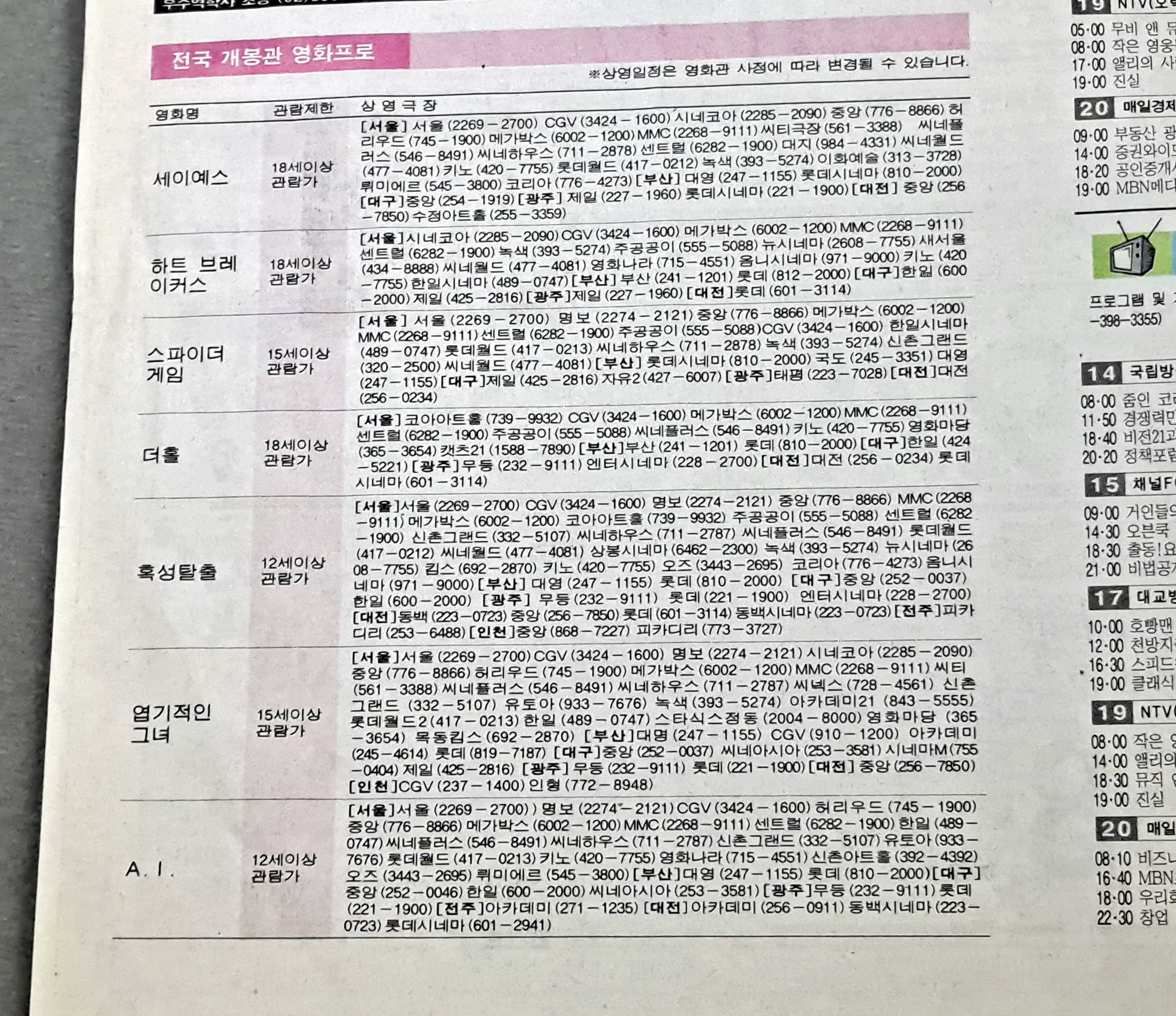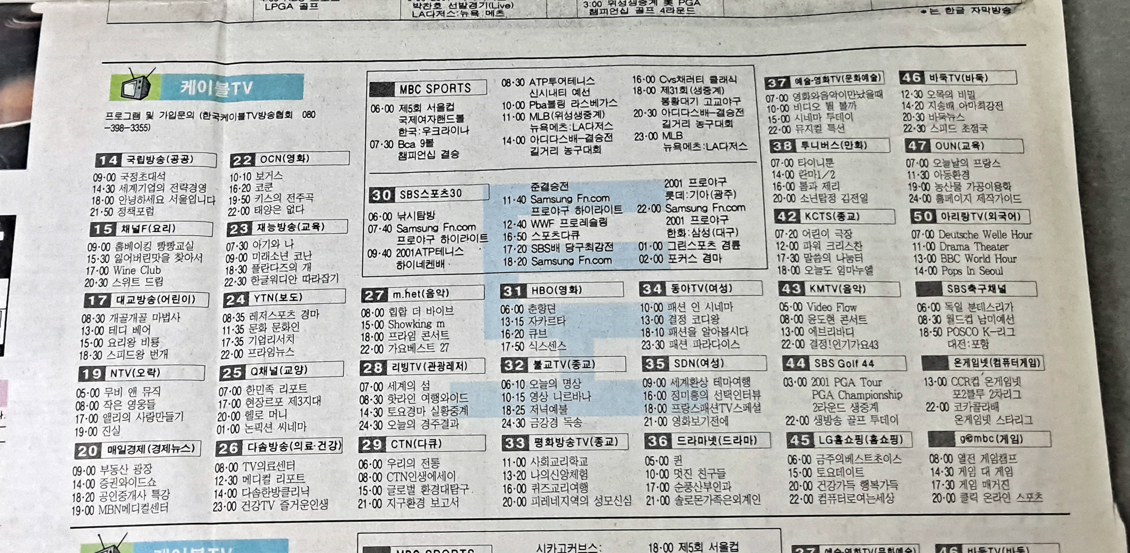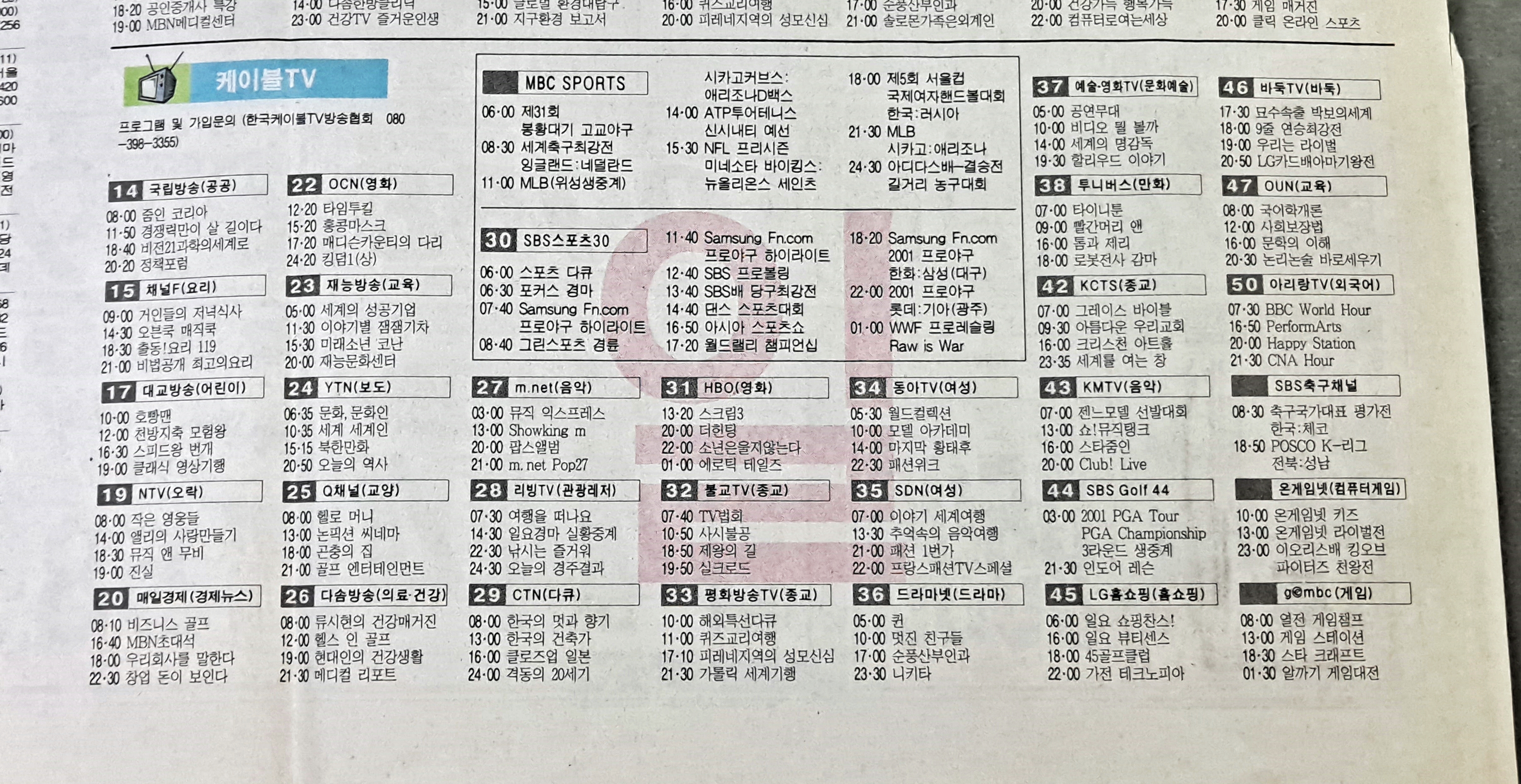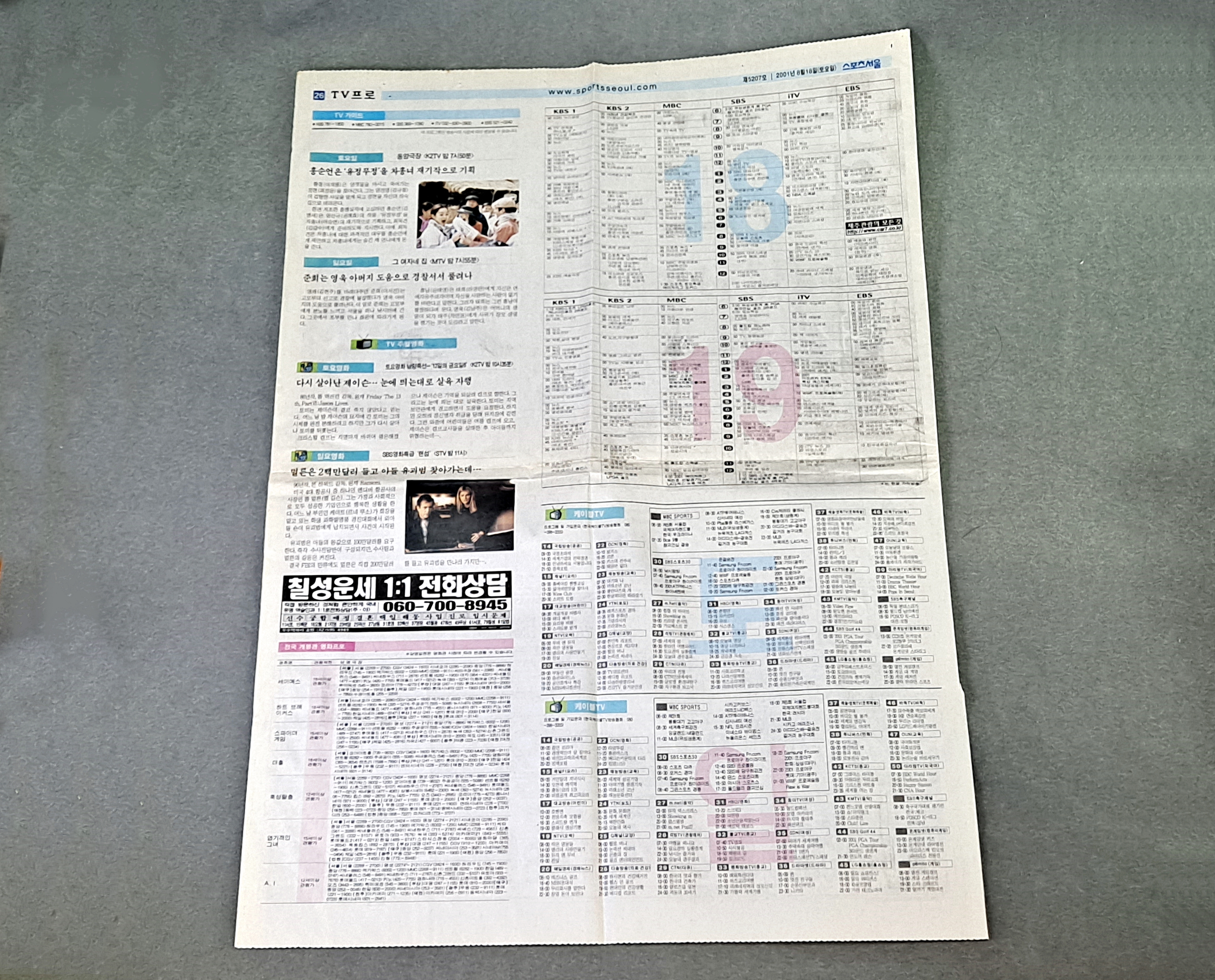2001년 8월 18 ,19일 신문 방송 편성표