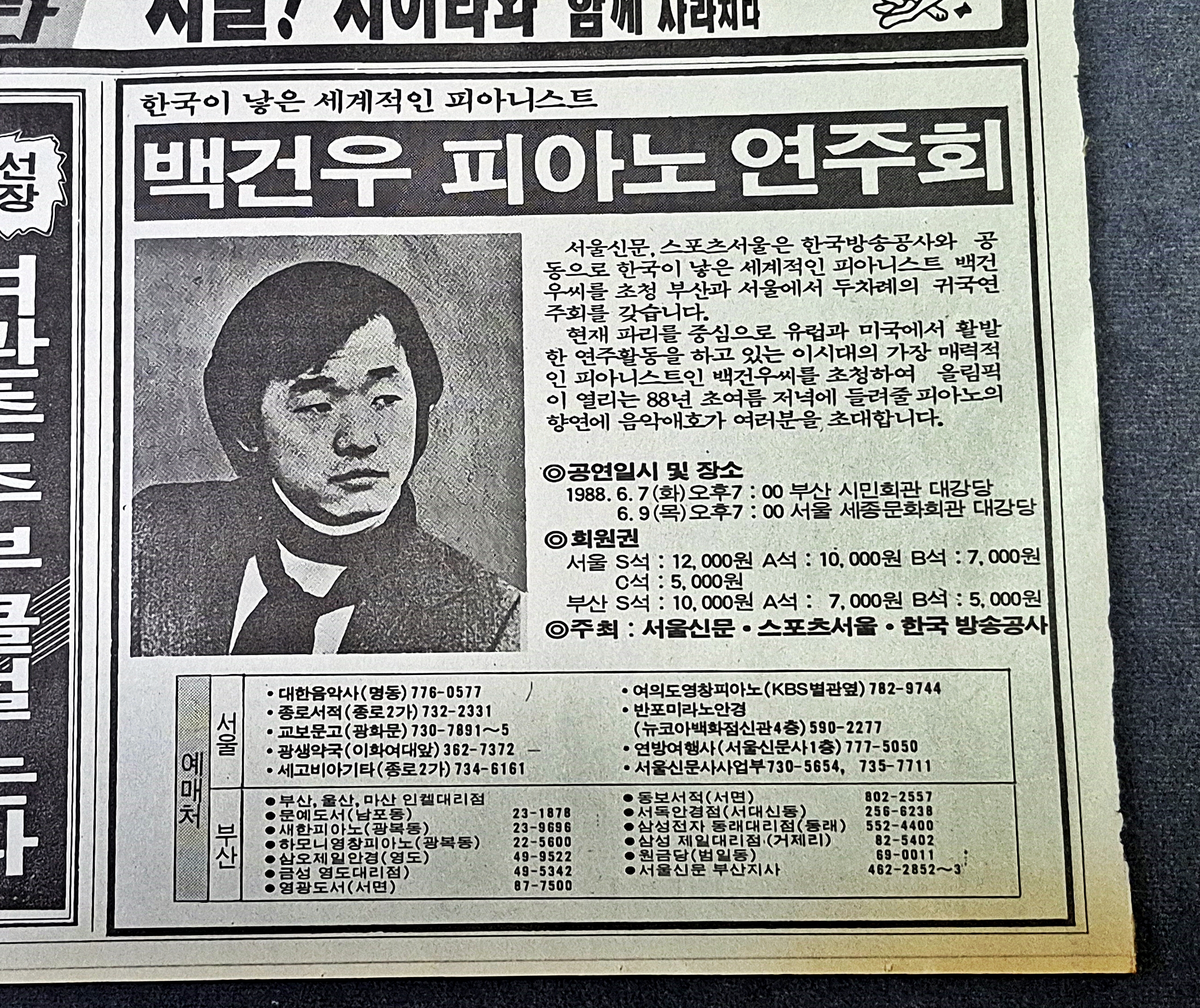 피아니스트 백건우의 연주회 예매 광고도 있습니다.
